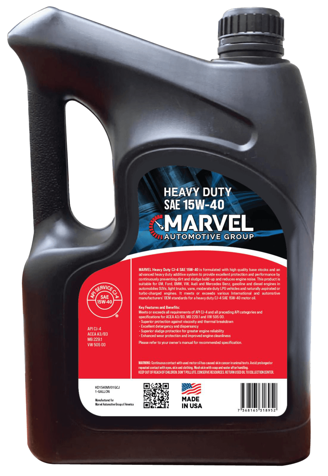 MARVEL Heavy Duty CJ-A SAE 15W-40 is formulated with high quality base stocks and an advanced heavy duty additive system to provide excellent protection and performance by continuously preventing dirt and sludge build-up and reduces engine noise. This product is suitable for GM, Ford, BMW, VW, Audi and Mercedes Benz, gasoline and diesel engines in automobiles, SUVs, ligh trucks, vans, moderate duty LPG vehicles and naturally aspirated or turbo-charged engines. It meets or exceeds various International and automotive manufactureres' OEM standards for a heavy duty CJ-4 SAE 15W-40 motor oil.