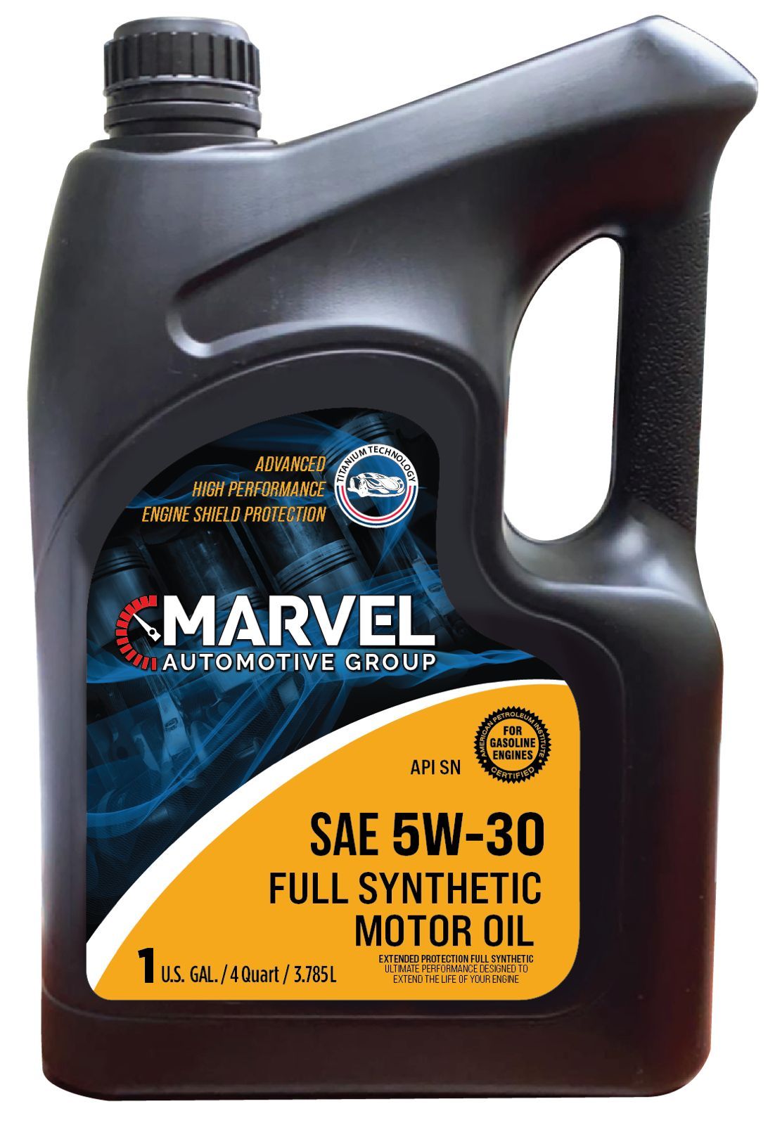 MARVEL Full Synthetic SN SAE 5W-30 is a superior grade motor oil blended from high quality full synthetic base stocks and a perfectly balanced additive system to deliver outstanding high performance and protection for longer servce intervals. It is suitable for gasoline and diesel automobiles and light duty trucks requiring an API SN motor oil. It provides maximum protection for high-performance, turbo-charged, supercharged gasoline and certain diesel multi-valve fuel injected system engines operating all conditions.