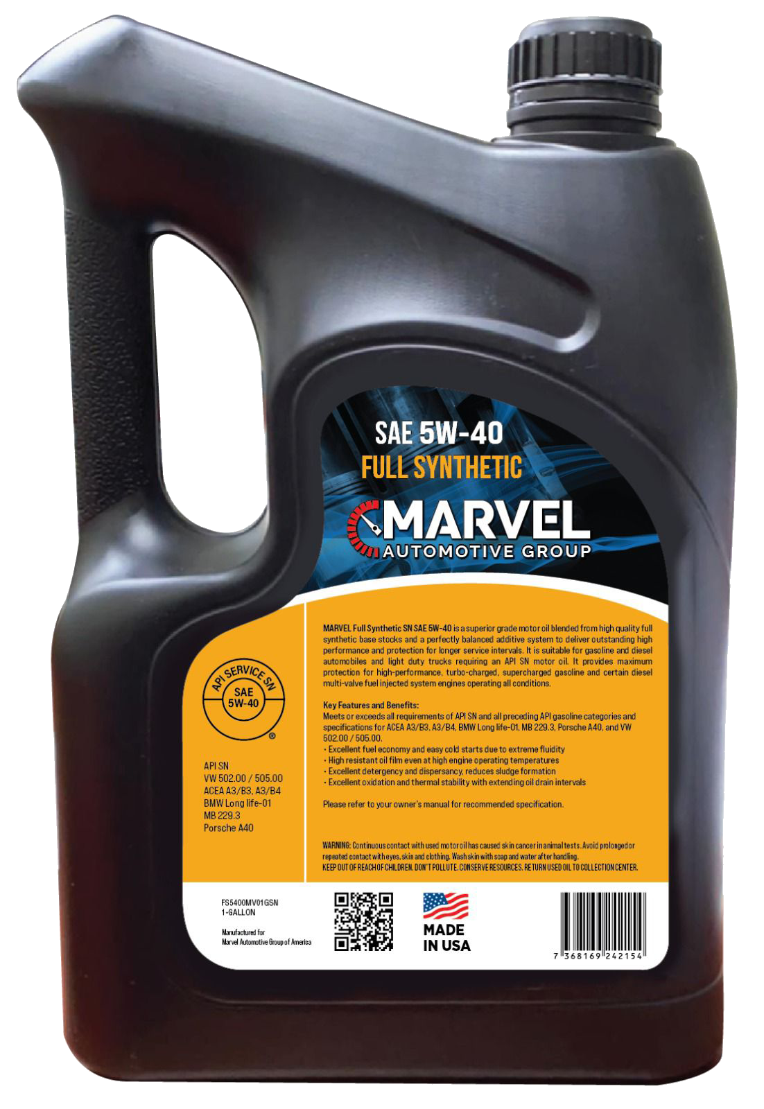 MARVEL Full Synthetic SN SAE 5W-30 is a superior grade motor oil blended from high quality full synthetic base stocks and a perfectly balanced additive system to deliver outstanding high performance and protection for longer servce intervals. It is suitable for gasoline and diesel automobiles and light duty trucks requiring an API SN motor oil. It provides maximum protection for high-performance, turbo-charged, supercharged gasoline and certain diesel multi-valve fuel injected system engines operating all conditions.