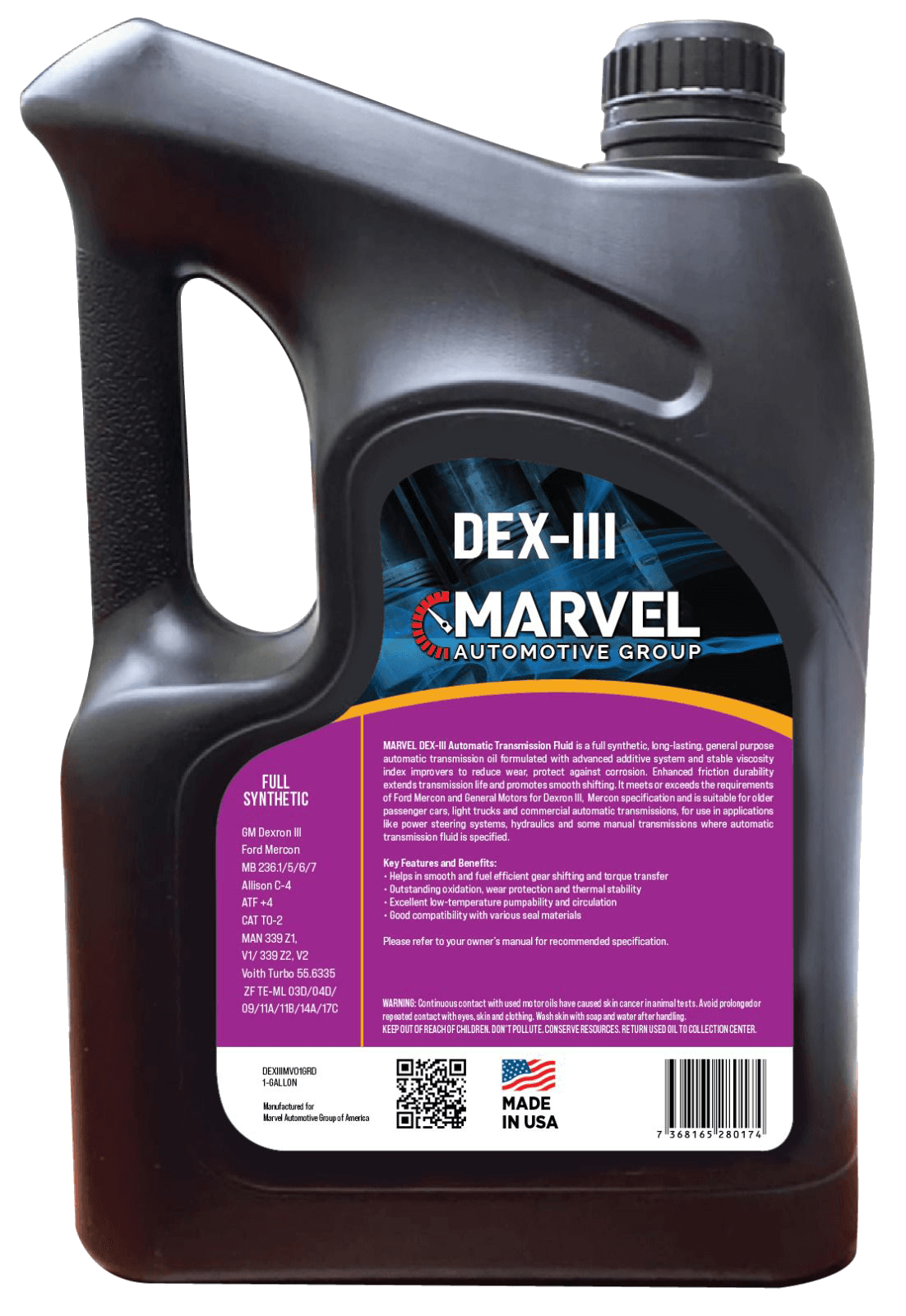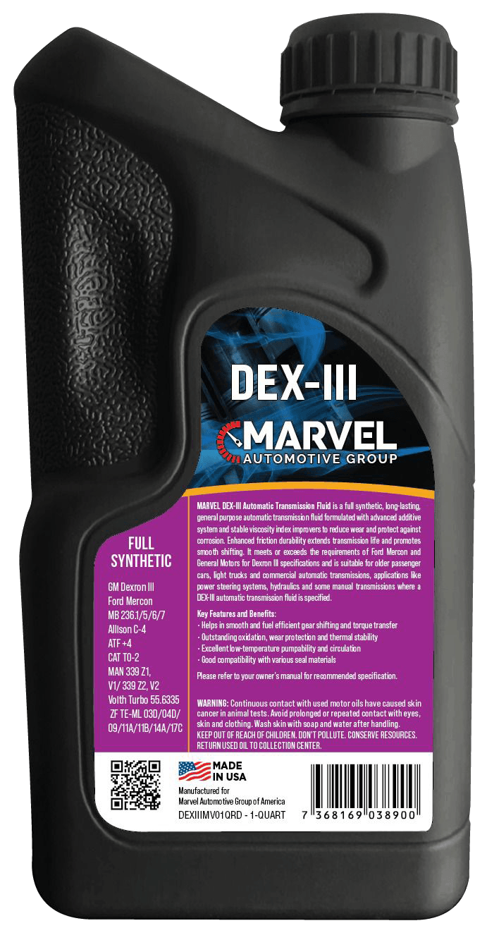 MARVEL DEX-III Automatic Transmission Fluid is an extra high-performance automatic transmission oil, formulated with high-quality hydro-treated base stocks, shear stable viscosity index improvers, and advanced additive system to meet or exceed the latest requirements of Ford Mercon and General Motors for Dexron III specification. Suitable for passenger cars and commercial automatic transmissions, for use in applications like power steering systems, hydraulics and some manual transmissions where automatic transmission fluid is specified.